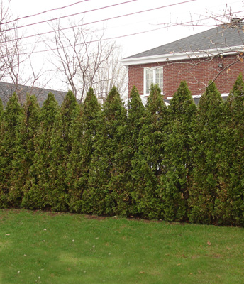 Si vous êtes sur un site venteux, je recommande d’installer une protection hivernale. Une simple clôture à neige en lattes de bois, placée à environ 30 cm (12 pouces) du feuillage, est généralement suffisante. En plus, si votre haie est exposée au sel de la rue, vous devriez mettre une jute sur votre clôture à neige. Dans certains cas extrêmes de vent et de sécheresse, je recommande la pose de clôture à neige dès l’implantation des arbres et de la conserver durant toute la première année (12 mois).